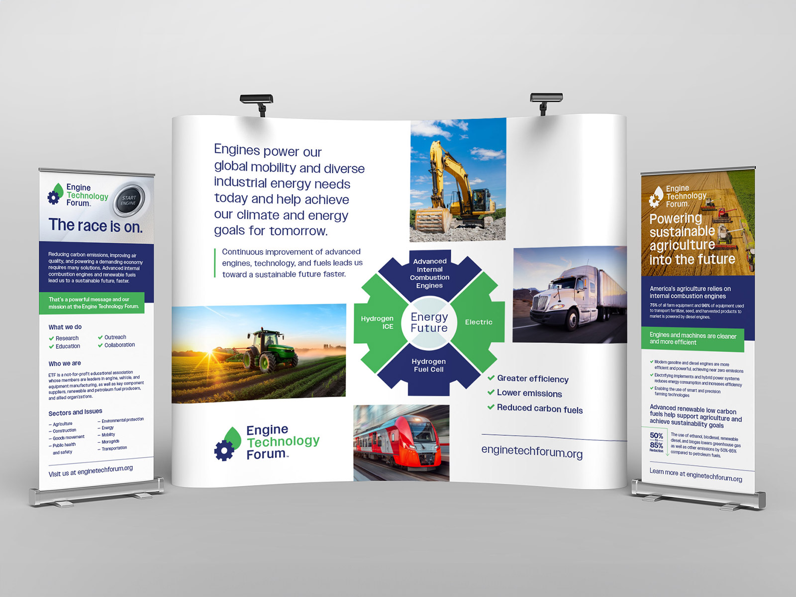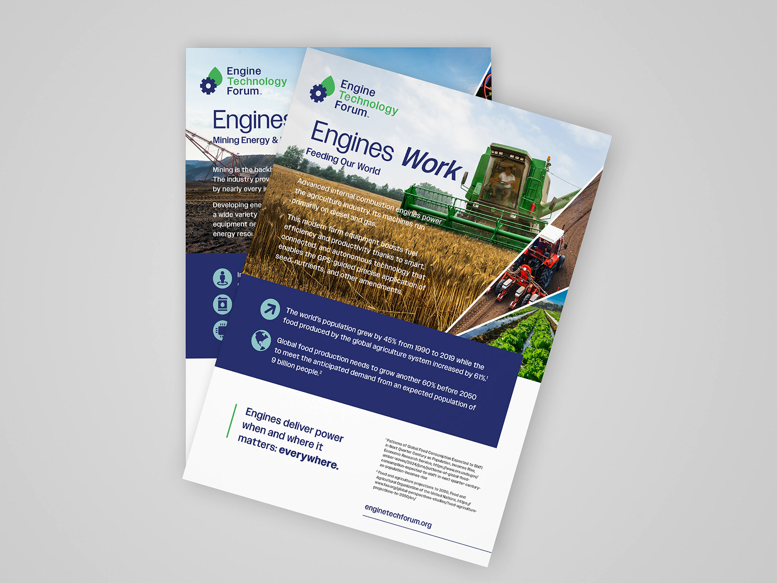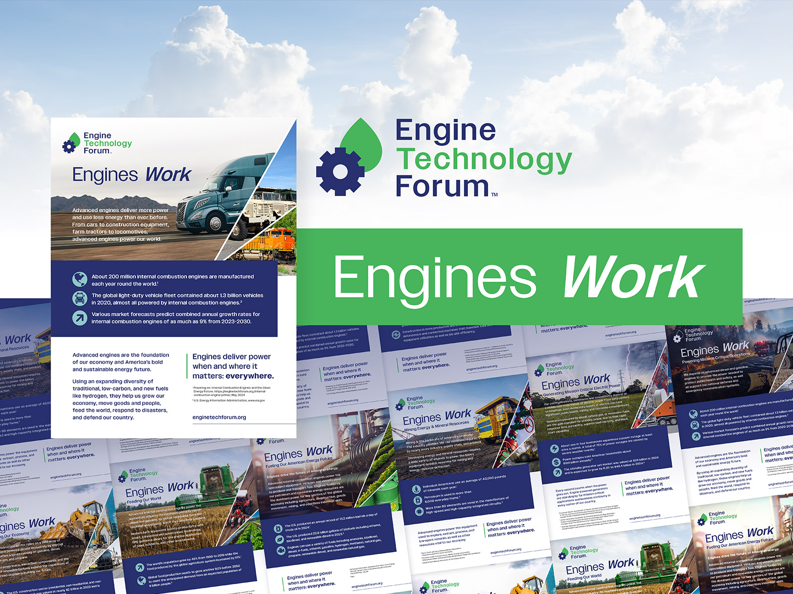 As lead designer, I developed a comprehensive set of marketing materials including one-sheets, datasheets, infographics, banners, booth environments, and full-page magazine ads. With the brand still taking shape, this work played a key role in defining how typography, color, imagery, and layout should be applied across different formats. Each piece was designed to communicate technical information clearly while maintaining a consistent and recognizable visual style. I focused on creating flexible design patterns that could adapt to a variety of content needs, from quick-reference materials to large-scale environmental graphics. The result is a unified collection of assets that not only supports Engine Technology Forum’s messaging but also serves as a foundation for future brand development.
