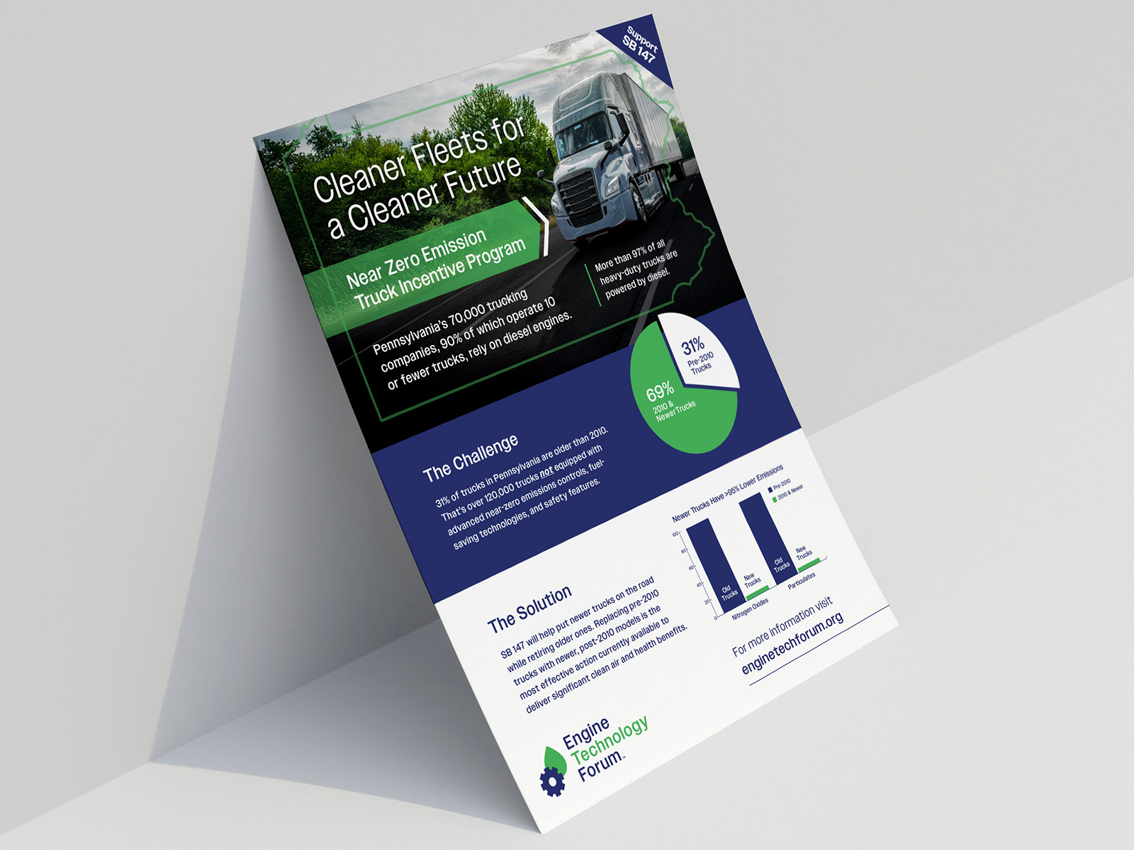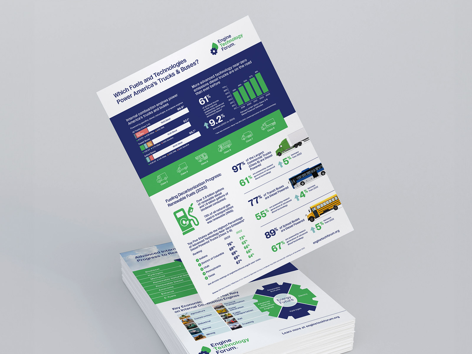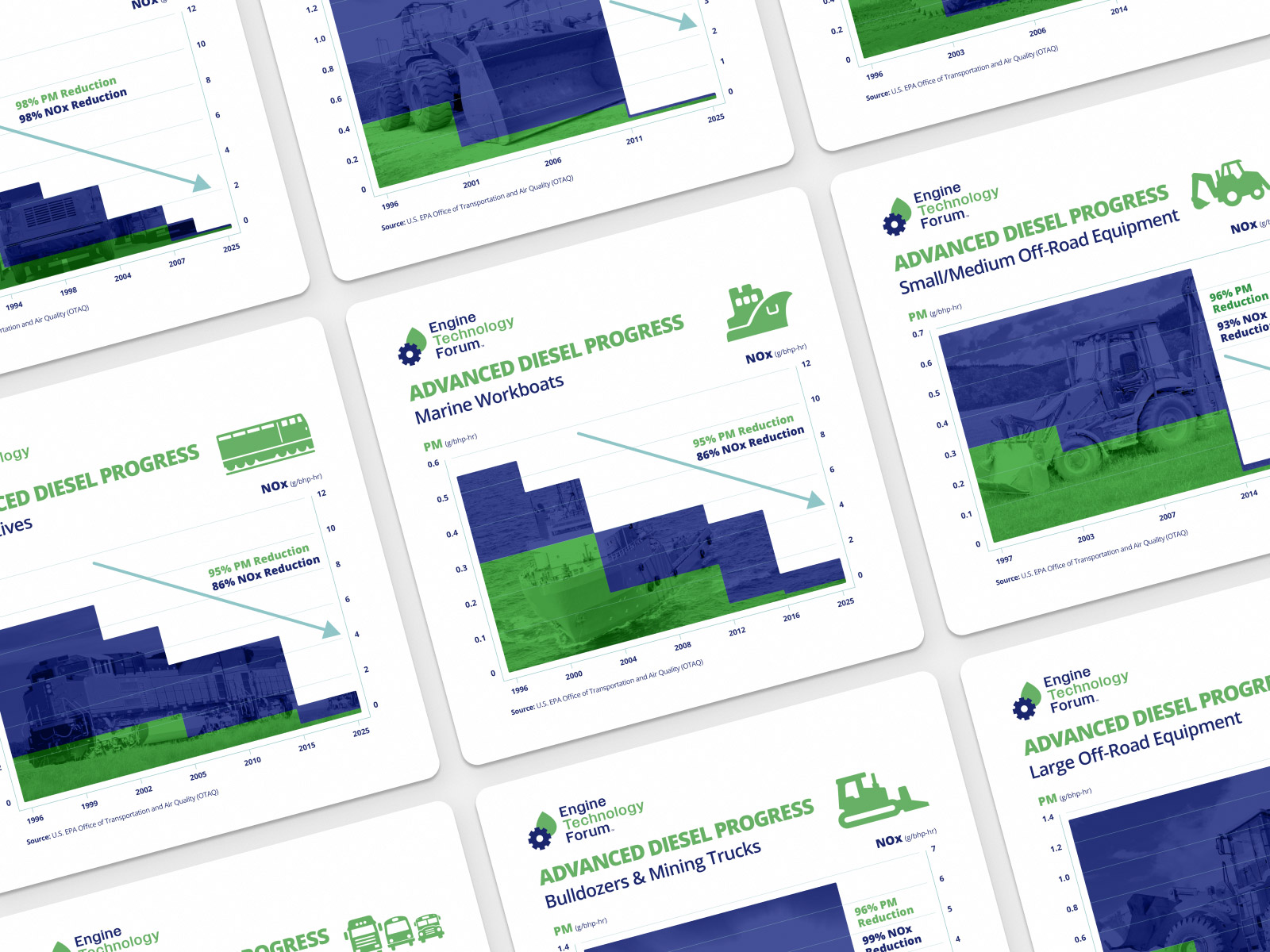 As lead designer, I developed a comprehensive set of marketing materials including one-sheets, datasheets, infographics, banners, booth environments, and full-page magazine ads. With the brand still taking shape, this work played a key role in defining how typography, color, imagery, and layout should be applied across different formats. Each piece was designed to communicate technical information clearly while maintaining a consistent and recognizable visual style. I focused on creating flexible design patterns that could adapt to a variety of content needs, from quick-reference materials to large-scale environmental graphics. The result is a unified collection of assets that not only supports Engine Technology Forum’s messaging but also serves as a foundation for future brand development.